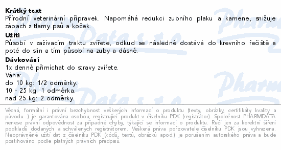 Přírodní veterinární přípravek. Napomáhá redukci zubního plaku a kamene, snižuje zápach z tlamy psů a koček.