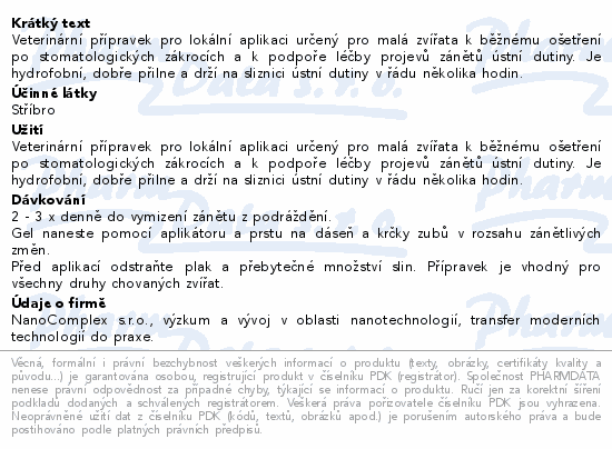 Veterinární přípravek pro lokální aplikaci určený pro malá zvířata k běžnému ošetření po stomatologických zákrocích a k podpoře léčby projevů zánětů ústní dutiny. Je hydrofobní, dobře přilne a drží na sliznici ústní dutiny v řádu několika hodin.