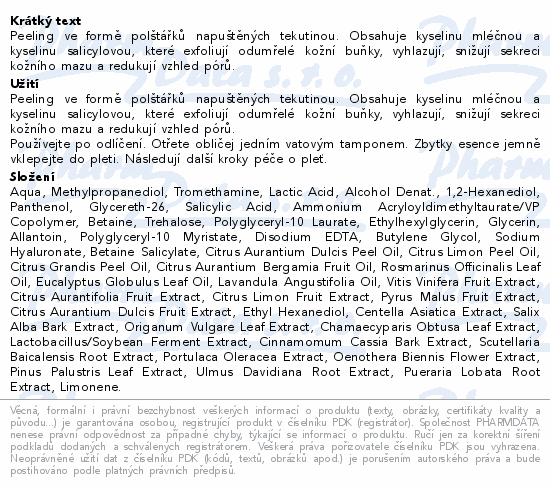Peeling ve formě polštářků napuštěných tekutinou. Obsahuje kyselinu mléčnou a kyselinu salicylovou, které exfoliují odumřelé kožní buňky, vyhlazují, snižují sekreci kožního mazu a redukují vzhled pórů.
