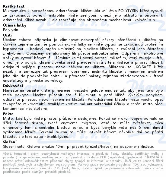 Mikroemulze k bezpečnému odstraňování klíšťat. Aktivní látka POLYLYSIN klíště vypudí ze zakousnutí, porézní mikrofilm klíště znehybní, omezí jeho aktivitu a připraví k odstranění. Klíště nezabíjí, ale zabraňuje jeho obrannému mechanismu uvolnění slin.