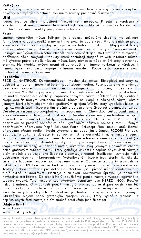 Pinzeta je vyrobena v atraktivním matném provedení. Je určena k vytrhávání chloupků z pokožky. Na styčných plochách jsou mikro zoubky pro pevnější uchycení.