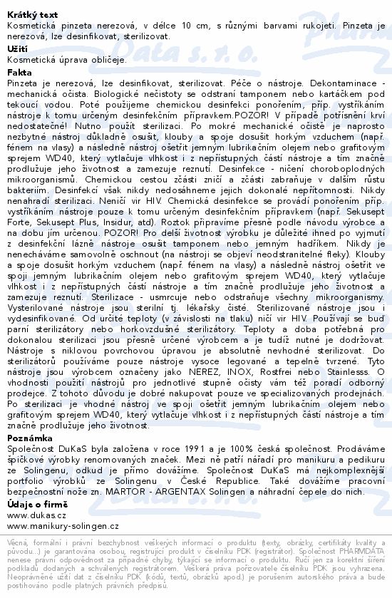 Kosmetická pinzeta nerezová, v délce 10 cm, s různými barvami rukojeti. Pinzeta je nerezová, lze desinfikovat, sterilizovat.