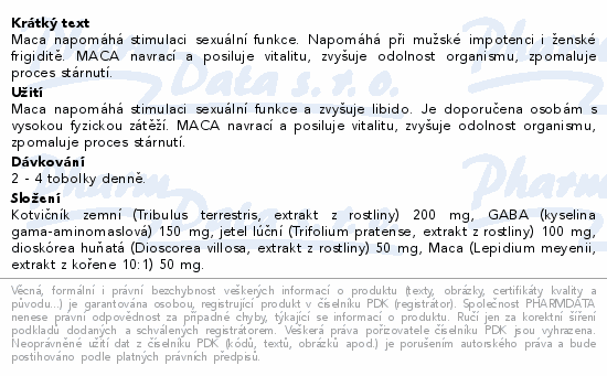 Maca napomáhá stimulaci sexuální funkce. Napomáhá při mužské impotenci i ženské frigiditě. MACA navrací a posiluje vitalitu, zvyšuje odolnost organismu, zpomaluje proces stárnutí.