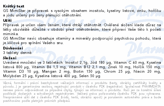GS MimiStar je přípravek s vysokým obsahem inositolu, kyseliny listové, zinku, hořčíku a jódu určený pro ženy plánující otěhotnění.