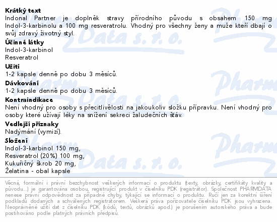 Indonal Partner je doplněk stravy přírodního původu s obsahem 150 mg Indol-3-karbinolu a 100 mg resveratrolu. Vhodný pro všechny ženy a muže kteří dbají o svůj zdravý životný styl.