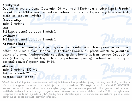 Doplněk stravy pro ženy. Obsahuje 150 mg Indol-3-Karbinolu v jedné kapsli. Přírodní produkt. Indol-3-karbinol se získává šetrnou extrakcí z kapustovitých rostlin (zelí, brokolice, kapusta, květák).