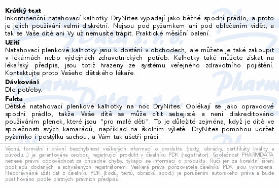 Inkontinenční natahovací kalhotky DryNites vypadají jako běžné spodní prádlo, a proto je jejich používání velmi diskrétní. Nejsou pod pyžamkem ani pod oblečením vidět, a tak se Vaše dítě ani Vy už nemusíte trápit. Praktické měsíční balení.