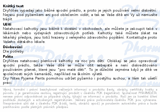 DryNites vypadají jako běžné spodní prádlo, a proto je jejich používání velmi diskrétní. Nejsou pod pyžamkem ani pod oblečením vidět, a tak se Vaše dítě ani Vy už nemusíte trápit.
