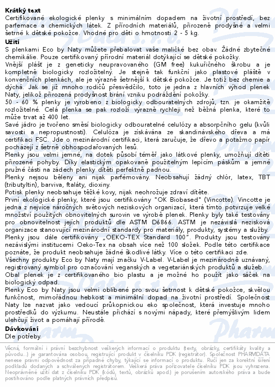 Certifikované ekologické plenky s minimálním dopadem na životní prostředí, bez parfemace a chemických látek. Z přírodních materiálů, přirozeně prodyšné a velmi šetrné k dětské pokožce. Vhodné pro děti o hmotnosti 2 - 5 kg.