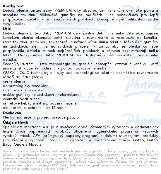 Dětská plenka Linteo Baby PREMIUM díky absorbujícím kanálkům okamžitě pohltí a uzamkne tekutinu. Měkoučké gumičky na zádičkách i na nohavičkách pro lepší přizpůsobení děťátku v těch nejrůznějších polohách. Dostupné v pěti velikostech podle váhy děťátka.