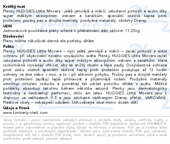 Plenky HUGGIES Little Movers - ještě jemnější a měkčí; celodenní pohodlí a sucho díky super měkkým absorpčním vrstvám a kanálkům; speciální zádová kapsa proti protečení; pružný pas a dvojité manžety; prodyšné materiály; obrázky Disney.