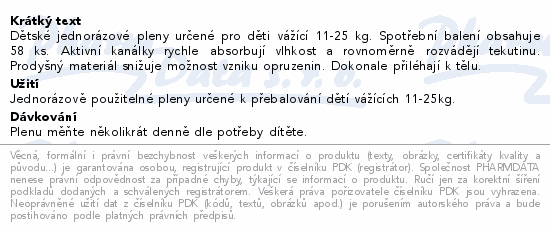 Dětské jednorázové pleny určené pro děti vážící 11-25 kg. Spotřební balení obsahuje 58 ks. Aktivní kanálky rychle absorbují vlhkost a rovnoměrně rozvádějí tekutinu. Prodyšný materiál snižuje možnost vzniku opruzenin. Dokonale přiléhají k tělu.