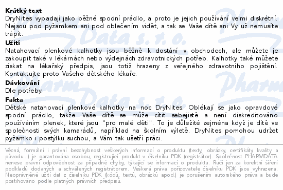 DryNites vypadají jako běžné spodní prádlo, a proto je jejich používání velmi diskrétní. Nejsou pod pyžamkem ani pod oblečením vidět, a tak se Vaše dítě ani Vy už nemusíte trápit.