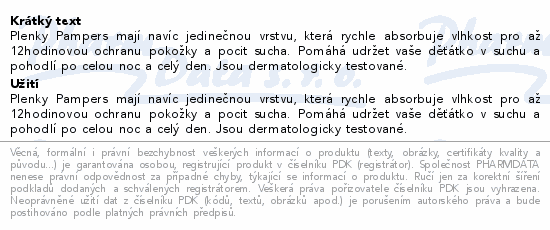 Plenky Pampers mají navíc jedinečnou vrstvu, která rychle absorbuje vlhkost pro až 12hodinovou ochranu pokožky a pocit sucha. Pomáhá udržet vaše děťátko v suchu a pohodlí po celou noc a celý den. Jsou dermatologicky testované.