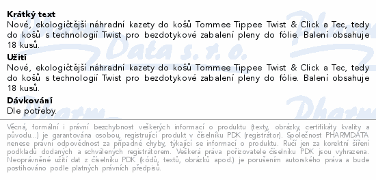 Nové, ekologičtější náhradní kazety do košů Tommee Tippee Twist & Click a Tec, tedy do košů s technologií Twist pro bezdotykové zabalení pleny do fólie. Balení obsahuje 18 kusů.