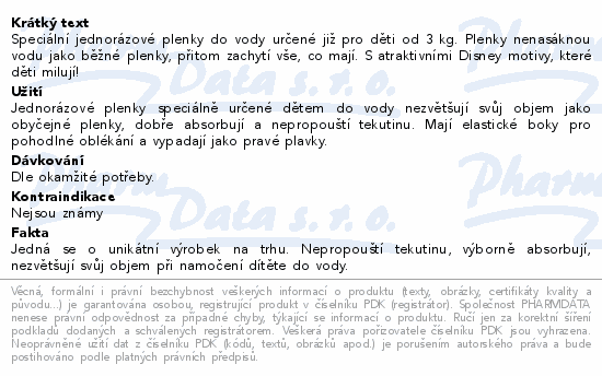 Speciální jednorázové plenky do vody určené již pro děti od 3 kg. Plenky nenasáknou vodu jako běžné plenky, přitom zachytí vše, co mají. S atraktivními Disney motivy, které děti milují!