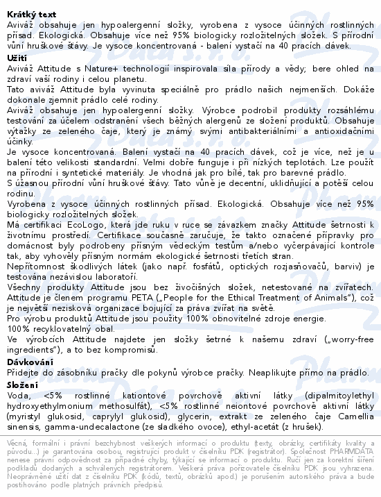 Aviváž obsahuje jen hypoalergenní složky, vyrobena z vysoce účinných rostlinných přísad. Ekologická. Obsahuje více než 95% biologicky rozložitelných složek. S přírodní vůní hruškové šťávy. Je vysoce koncentrovaná - balení vystačí na 40 pracích dávek.