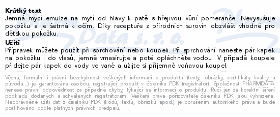 Jemná mycí emulze na mytí od hlavy k patě s hřejivou vůní pomeranče. Nevysušuje pokožku a je šetrná k očím. Díky receptuře z přírodních surovin obzvlášť vhodné pro dětskou pokožku.