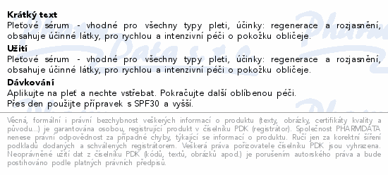 Pleťové sérum - vhodné pro všechny typy pleti, účinky: regenerace a rozjasnění, obsahuje účinné látky, pro rychlou a intenzivní péči o pokožku obličeje.