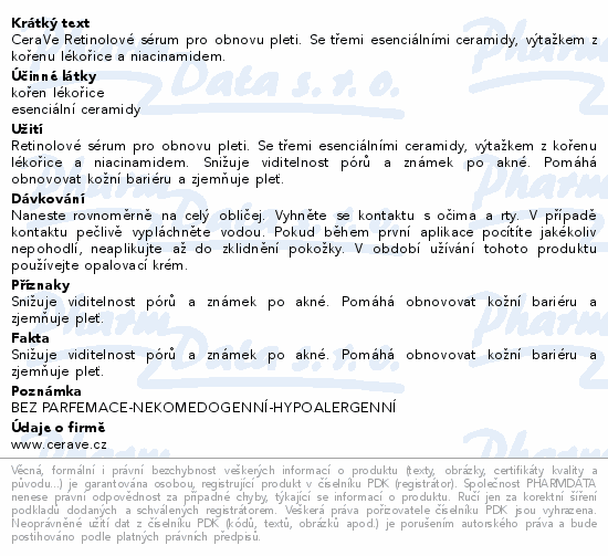 CeraVe Retinolové sérum pro obnovu pleti, je vyvinuté ve spolupráci s dermatology, pomáhá vyhlazovat texturu pokožky tím, že snižuje viditelnost stop po akné, minimalizuje vzhled pórů a zlepšuje povrch pokožky. Obsahuje zapouzdřený retinol, který pomáhá obnovovat povrch pleti a podporuje její přirozenou obnovu, aniž by nadměrně dráždil citlivou pokožku a extrakt z kořene lékořice, který pomáhá pokožku rozjasnit. Navíc obsahuje tři esenciální ceramidy, které obnovují a posilují kožní bariéru, spolu se zklidňujícím niacinamidem, který má i regenerační účinky, pomáhá snižovat začervenání a podporuje rovnoměrný tón pleti. Lehká, gelová textura se snadno roztírá, rychle vstřebává a nezanechává mastný film. Je nekomedogenní, bez parabenů a bez parfemace. Sérum se doporučuje používat večer na čistou pleť. Ze začátku 2–3× týdně, postupně je možné frekvenci zvýšit dle tolerance pleti. Přes den je důležité aplikovat krém s vysokým SPF, protože retinol zvyšuje citlivost pleti na slunce.
