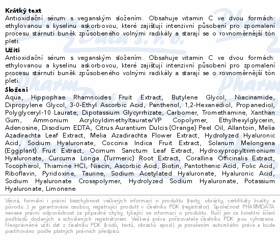 Antioxidační sérum s veganským složením. Obsahuje vitamin C ve dvou formách: ethylovanou a kyselinu askorbovou, které zajišťují intenzivní působení pro zpomalení procesu stárnutí buněk způsobeného volnými radikály a starají se o rovnoměrnější tón pleti.