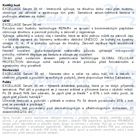 EXCELLAGE Serum 30 ml - Intenzivně vyživuje, na dlouhou dobu vrací pleti hustotu, obnovuje její zářivost a sjednocuje tón pleti. Sametová sérum-krémová textura s pudrovým efektem na dotek.