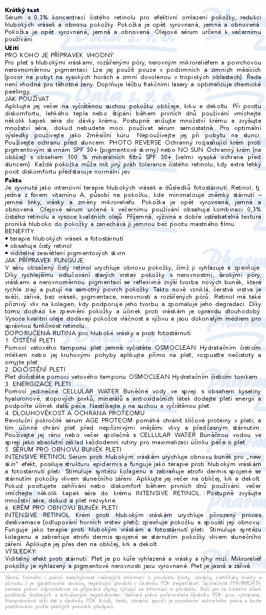 Sérum s 0,3% koncentrací čistého retinolu pro efektivní omlazení pokožky, redukci hlubokých vrásek a obnovu pokožky. Pokožka je opět vyrovnaná, jemná a obnovená. Pokožka je opět vyrovnaná, jemná a obnovená. Olejové sérum určené k večernímu používání.