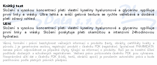 Složení s vysokou koncentrací pleti vlastní kyseliny hyaluronové a glycerinu vyplňuje první linky a vrásky. Ultra lehká a svěží gelová textura se rychle vstřebává a dodává pleti zdravý vzhled.
