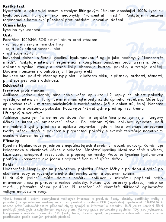 Hydratační a vyhlazující sérum s trvalým liftingovým účinkem obsahující 100% kyselinu hyaluronovou. Funguje jako neobvyklý "koncentrát mládí". Poskytuje intenzivní regeneraci a komplexní působení proti vráskám. Inovativní složení.