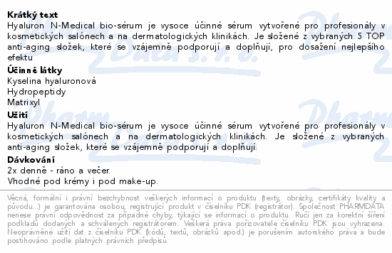 Hyaluron N-Medical bio-sérum je vysoce účinné sérum vytvořené pro profesionály v kosmetických salónech a na dermatologických klinikách. Je složené z vybraných 5 TOP anti-aging složek, které se vzájemně podporují a doplňují, pro dosažení nejlepšího efektu