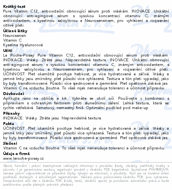 LA ROCHE-POSAY PURE Vitamin C12 sérum je dermokosmetické sérum s vysokou koncentrací čistého vitamínu C (12 %), určené pro rozjasnění a vyhlazení pleti, snížení výskytu jemných vrásek a podporu sjednoceného tónu pokožky. Je vhodné i pro citlivou pleť díky svému šetrnému složení a minimalistické receptuře. Obsahuje čistý vitamin C, základní aktivní složku v boji proti stárnutí, která rozjasňuje pleť a vyhlazuje vrásky a jemné linky. Vitamin C může také potlačovat produkci melaninu a redukovat tak výskyt pigmentových skvrn. Má také antioxidační účinky a podporuje syntézu kolagenu, čímž přispívá ke zpevnění a vyhlazení pleti. Sérum je rovněž obohaceno o kyselinu salicylovou, která zvyšuje účinky séra na strukturu pleti, uvolňuje póry a snižuje tvorbu kožního mazu. Textura séra je lehká a rychle se vstřebávající, je ideální pro použití ráno. Produkt je bez parfemace, nekomedogenní a dermatologicky testován. Doporučuje se nanášet několik kapek na čistou pleť obličeje, krku a dekoltu před aplikací krému.