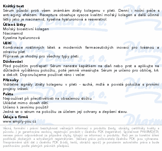 Sérum působí proti všem známkám ztráty kolagenu v pleti. Denní i noční péče s anti-aging efektem. Receptura obsahuje vysoce kvalitní mořský kolagen a další účinné látky jako je niacinamid, kyselina hyaluronová a resveratrol.