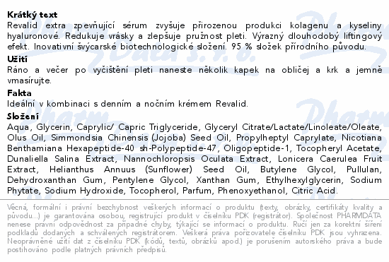 Revalid extra zpevňující sérum zvyšuje přirozenou produkci kolagenu a kyseliny hyaluronové. Redukuje vrásky a zlepšuje pružnost pleti. Výrazný dlouhodobý liftingový efekt. Inovativní švýcarské biotechnologické složení. 95 % složek přírodního původu.