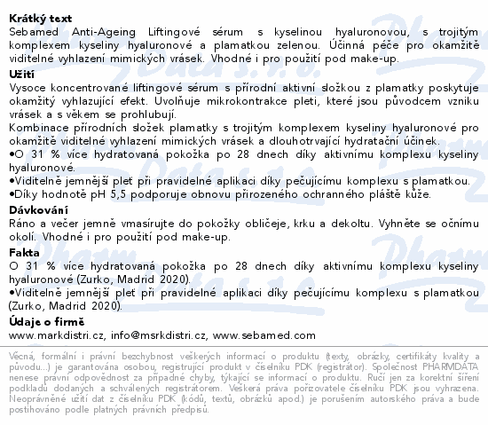 Sebamed Anti-Ageing Liftingové sérum s kyselinou hyaluronovou, s trojitým komplexem kyseliny hyaluronové a plamatkou zelenou. Účinná péče pro okamžitě viditelné vyhlazení mimických vrásek. Vhodné i pro použití pod make-up.