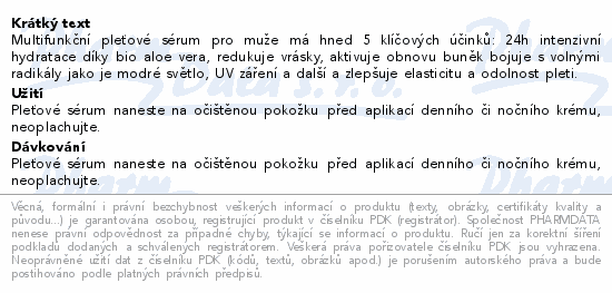 Multifunkční pleťové sérum pro muže má hned 5 klíčových účinků: 24h intenzivní hydratace díky bio aloe vera, redukuje vrásky, aktivuje obnovu buněk bojuje s volnými radikály jako je modré světlo, UV záření a další a zlepšuje elasticitu a odolnost pleti.