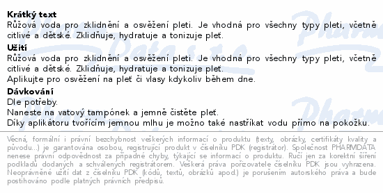 Růžová voda pro zklidnění a osvěžení pleti. Je vhodná pro všechny typy pleti, včetně citlivé a dětské. Zklidňuje, hydratuje a tonizuje pleť.