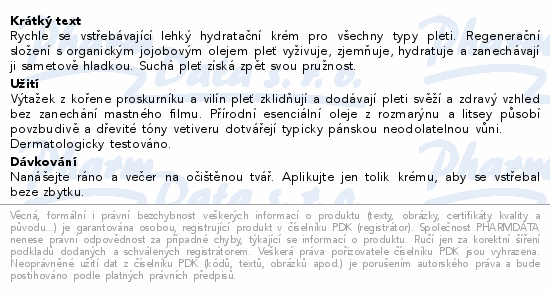 Rychle se vstřebávající lehký hydratační krém pro všechny typy pleti. Regenerační složení s organickým jojobovým olejem pleť vyživuje, zjemňuje, hydratuje a zanechávají ji sametově hladkou. Suchá pleť získá zpět svou pružnost.