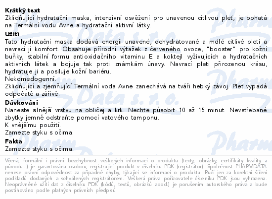 Zklidňující hydratační maska, intenzivní osvěžení pro unavenou citlivou pleť, je bohatá na Termální vodu Avne a hydratační aktivní látky.