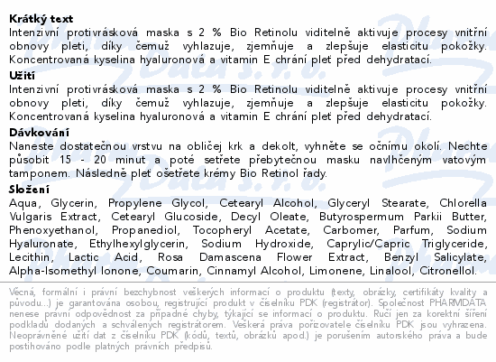 Intenzivní protivrásková maska s 2 % Bio Retinolu viditelně aktivuje procesy vnitřní obnovy pleti, díky čemuž vyhlazuje, zjemňuje a zlepšuje elasticitu pokožky. Koncentrovaná kyselina hyaluronová a vitamin E chrání pleť před dehydratací.