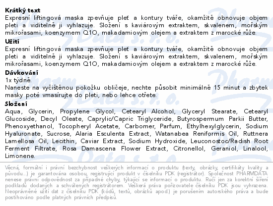 Expresní liftingová maska zpevňuje pleť a kontury tváře, okamžitě obnovuje objem pleti a viditelně ji vyhlazuje. Složení s kaviárovým extraktem, skvalenem, mořským mikrořasami, koenzymem Q1O, makadamiovým olejem a extraktem z marocké růže.