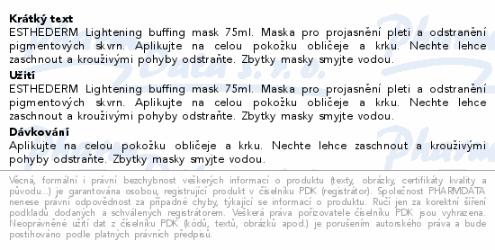 ESTHEDERM Lightening buffing mask 75ml. Maska pro projasnění pleti a odstranění pigmentových skvrn. Aplikujte na celou pokožku obličeje a krku. Nechte lehce zaschnout a krouživými pohyby odstraňte. Zbytky masky smyjte vodou.