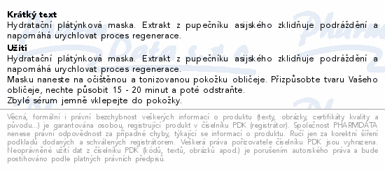 Hydratační plátýnková maska. Extrakt z pupečníku asijského zklidňuje podráždění a napomáhá urychlovat proces regenerace.