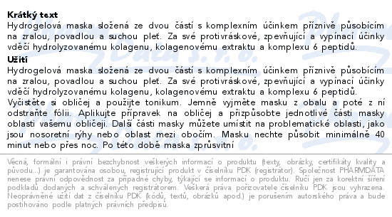 Hydrogelová maska složená ze dvou částí s komplexním účinkem příznivě působícím na zralou, povadlou a suchou pleť. Za své protivráskové, zpevňující a vypínací účinky vděčí hydrolyzovanému kolagenu, kolagenovému extraktu a komplexu 6 peptidů.