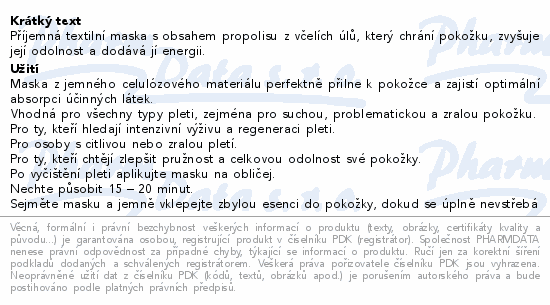 Příjemná textilní maska s obsahem propolisu z včelích úlů, který chrání pokožku, zvyšuje její odolnost a dodává jí energii.