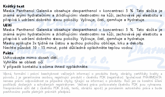 Maska Panthenol Galenika obsahuje dexpanthenol v koncentraci 5 %. Tato složka je známá svými hydratačními a zklidňujícími vlastnostmi na kůži, zachovává její elasticitu a přispívá k udržení dobrého stavu pokožky. Vyživuje, čistí, zjemňuje a hydratuje.