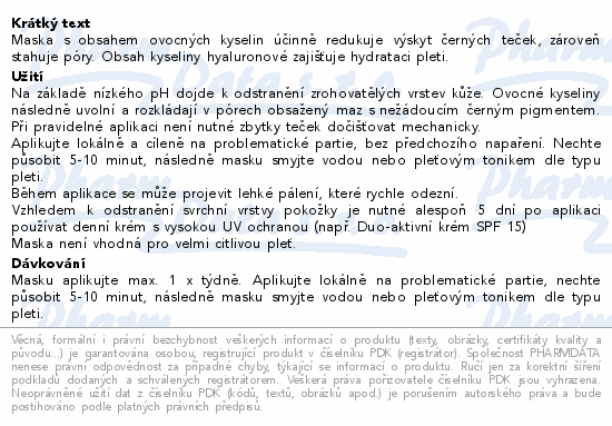 Maska s obsahem ovocných kyselin účinně redukuje výskyt černých teček, zároveň stahuje póry. Obsah kyseliny hyaluronové zajišťuje hydrataci pleti.
