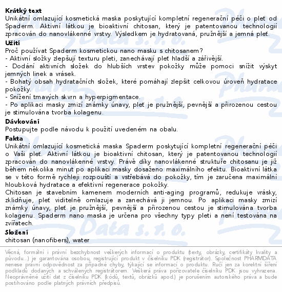 Unikátní omlazující kosmetická maska poskytující kompletní regenerační péči o pleť od Spaderm. Aktivní látkou je bioaktivní chitosan, který je patentovanou technologií zpracován do nanovlákenné vrstvy. Výsledkem je hydratovaná, pružnější a jemná pleť.