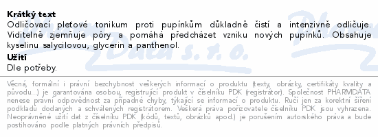 Odličovací pleťové tonikum proti pupínkům důkladně čistí a intenzivně odličuje. Viditelně zjemňuje póry a pomáhá předcházet vzniku nových pupínků. Obsahuje kyselinu salycilovou, glycerin a panthenol.