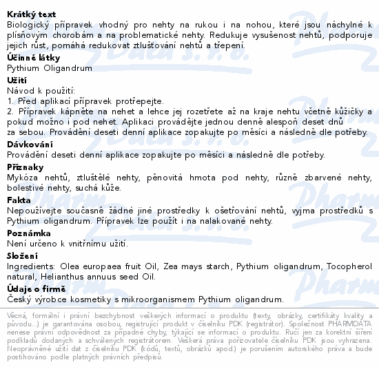 Biologický přípravek vhodný pro nehty na rukou i na nohou, které jsou náchylné k plísňovým chorobám a na problematické nehty. Redukuje vysušenost nehtů, podporuje jejich růst, pomáhá redukovat ztlušťování nehtů a třepení.