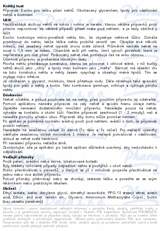 Přípravek Excilor pro léčbu plísní nehtů. Obohacený glycerolem, lipidy pro ošetřování nehtů a biotinem.